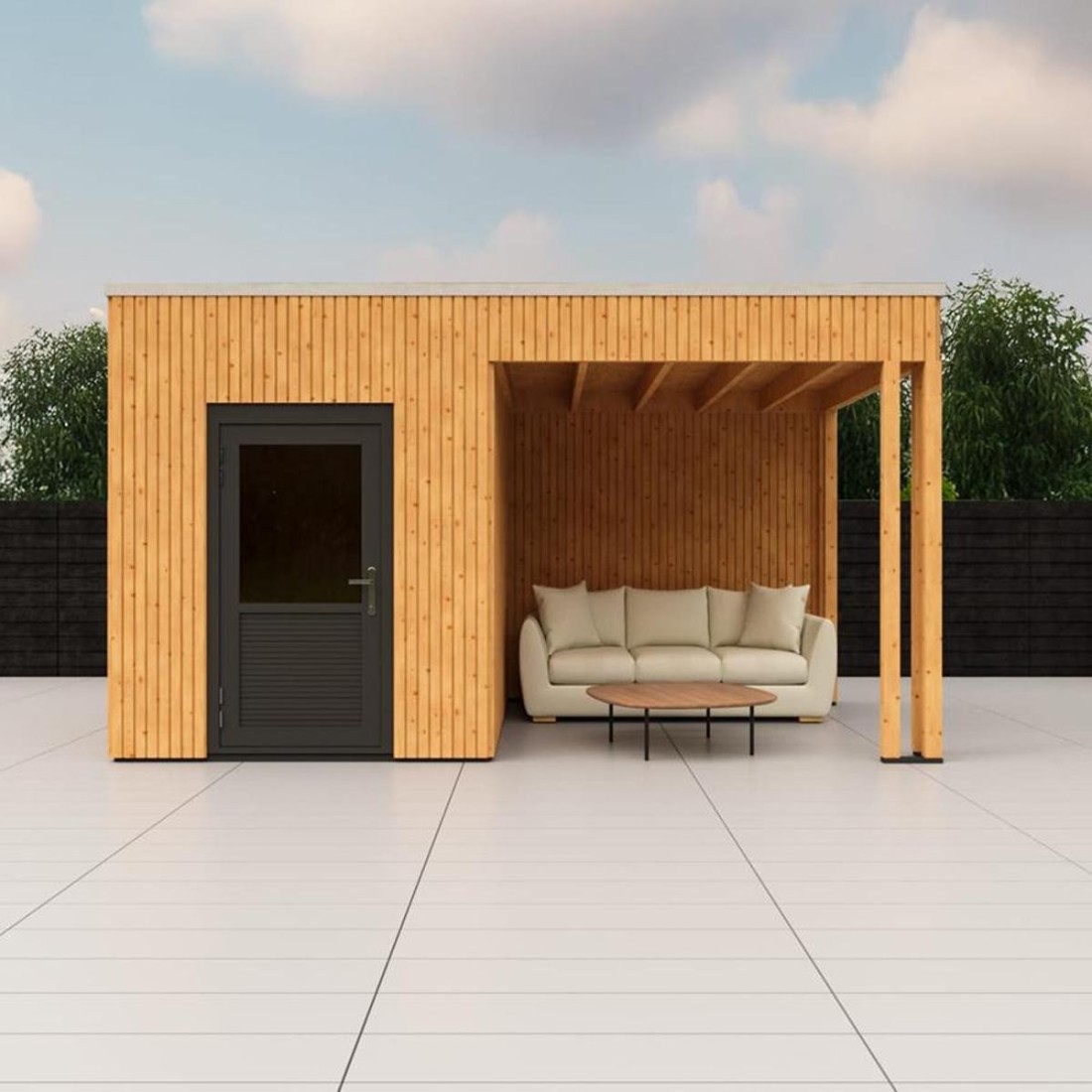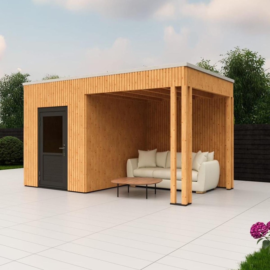 Stel u een plek voor waar praktisch gemak en ontspannen buitenleven samenkomen. Het Rhombus tuinhuis met overkapping combineert een ruime berging met een stijlvolle overdekte buitenruimte waar u het hele jaar door kunt genieten van uw tuin.
