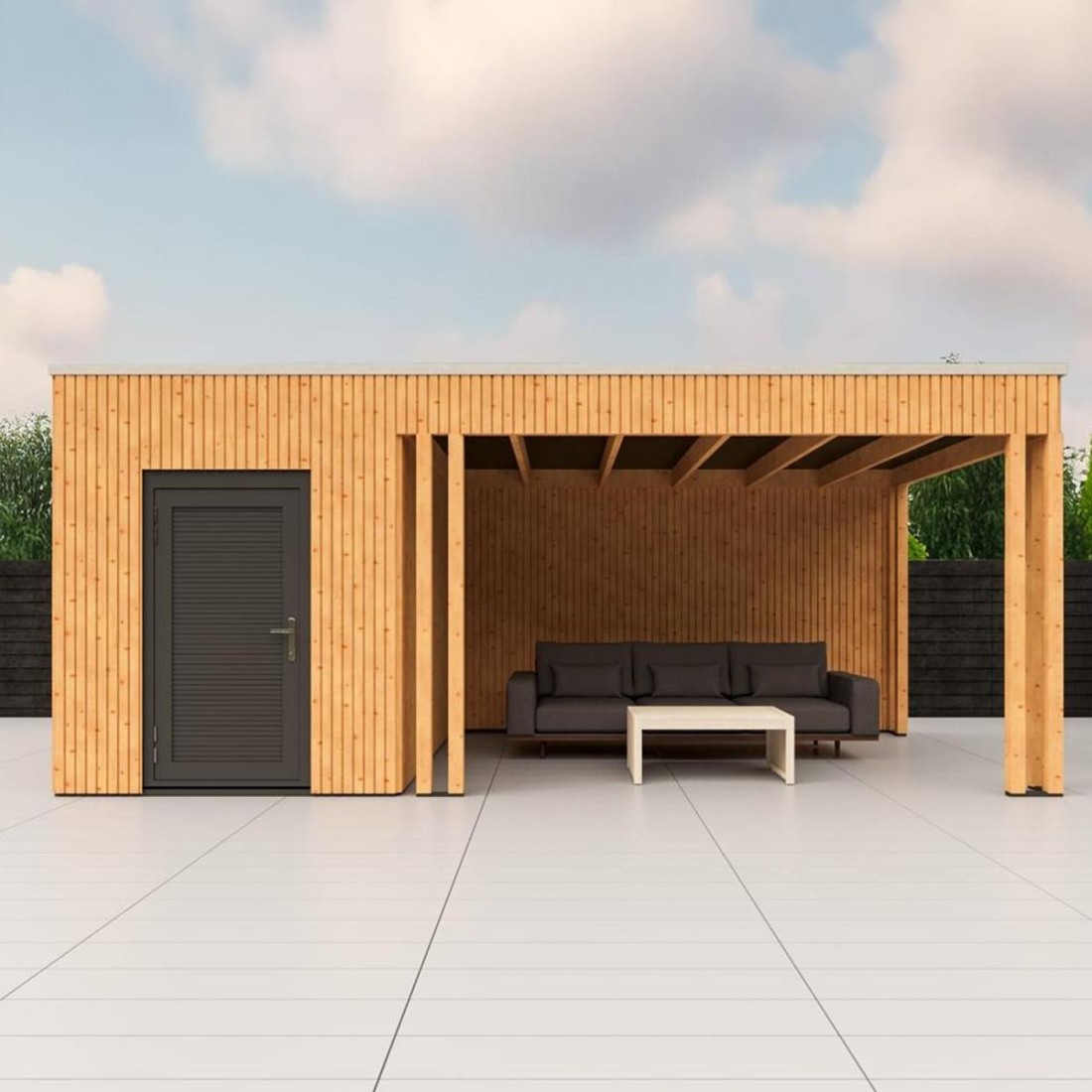 De moderne rhombus gevelbekleding geeft het geheel een strakke en architectonische uitstraling. De horizontale lijnen creëren diepte en rust in het ontwerp, waardoor het buitenverblijf naadloos aansluit bij moderne woningen en zorgvuldig ontworpen tuinen.