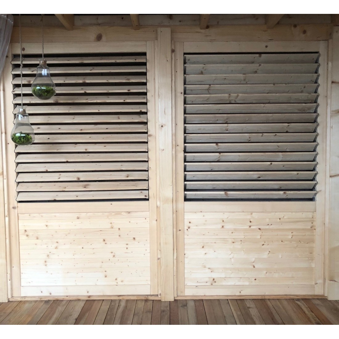 De set bestaat uit twee panelen, elk met een breedte van 132 cm en een hoogte van 214 cm. Elk paneel is voorzien van houten, verstelbare lamellen met een hoogte van 123 cm, waarmee je volledige controle hebt over privacy en luchtcirculatie. Dankzij de verstelbare lamellen kun je ze op warme dagen openen voor ventilatie, of sluiten op koelere avonden om meer privacy en comfort te creëren.