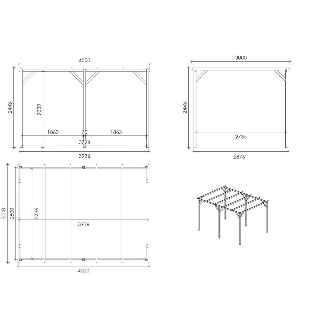 Met een breedte van 3 m, een diepte van 4 m en een doorgangshoogte van m biedt deze overkapping volop ruimte voor het stallen van uw auto, motor of fiets.