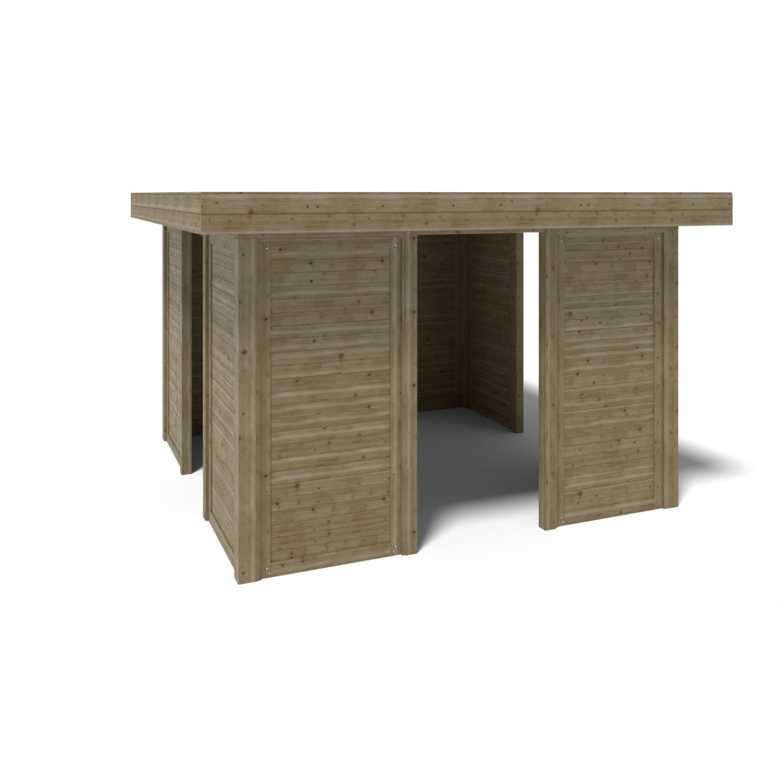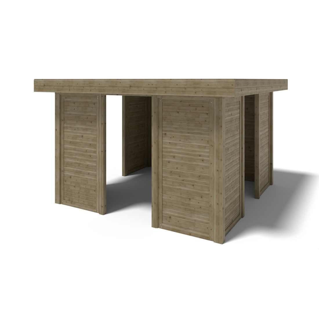 Met een oppervlakte van 16.3 m² en stevige balken van 120x120 mm dik vormt het een elegante overkapping voor elk seizoen.