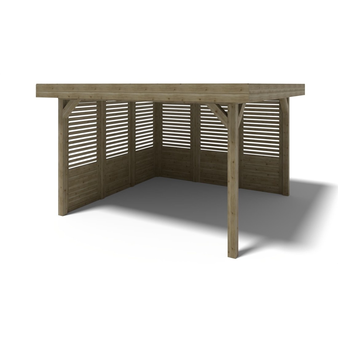 Met een oppervlakte van 16.3 m² en stevige balken van 120x120 mm dik vormt het een elegante overkapping voor elk seizoen.