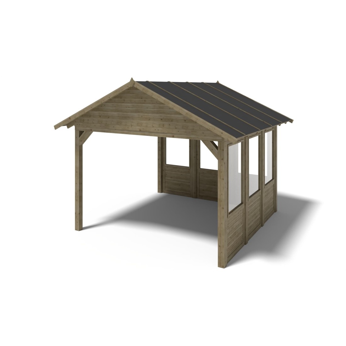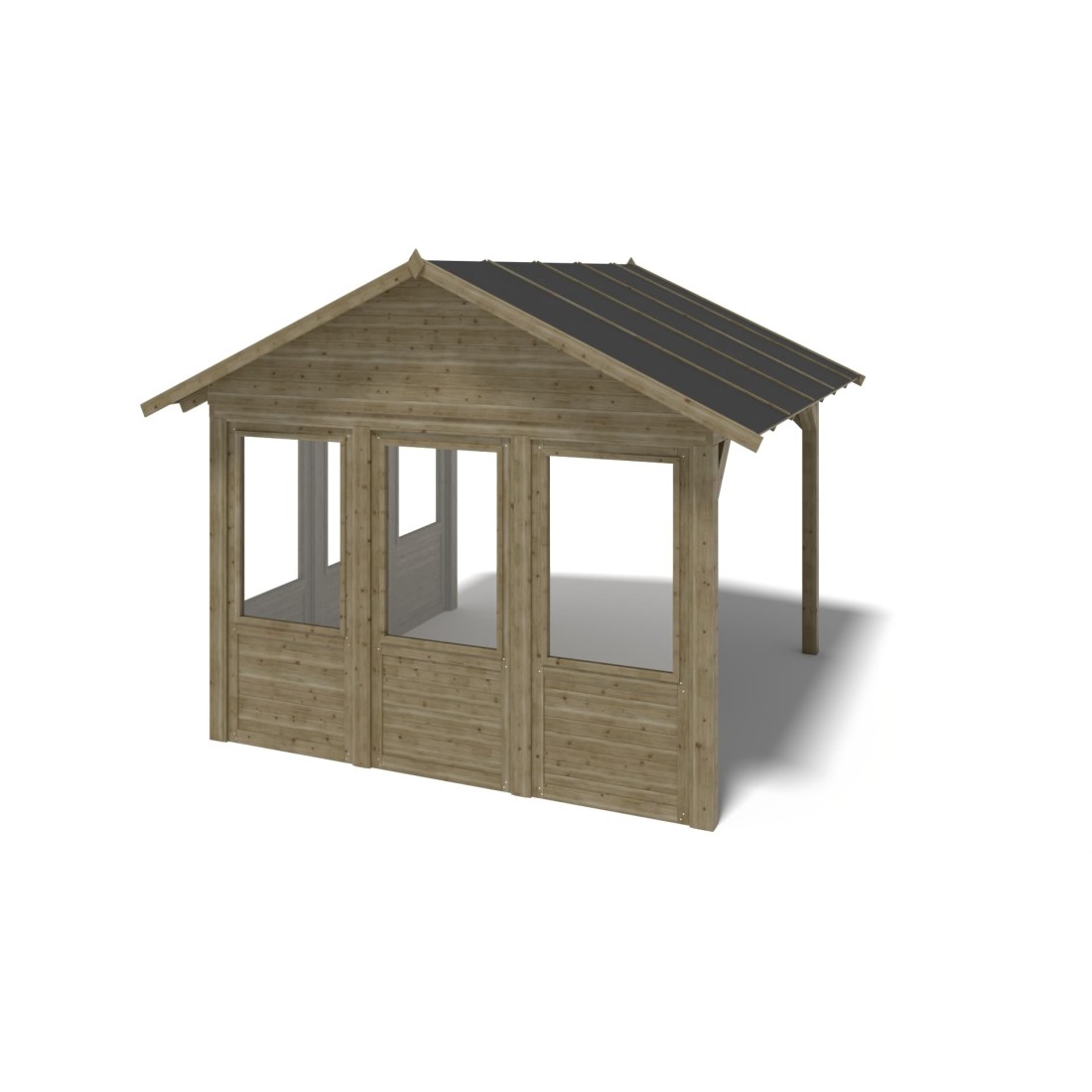 Met een oppervlakte van 16.3 m² en stevige balken van 120x120 mm dik vormt het een solide en tijdloos middelpunt in de tuin.