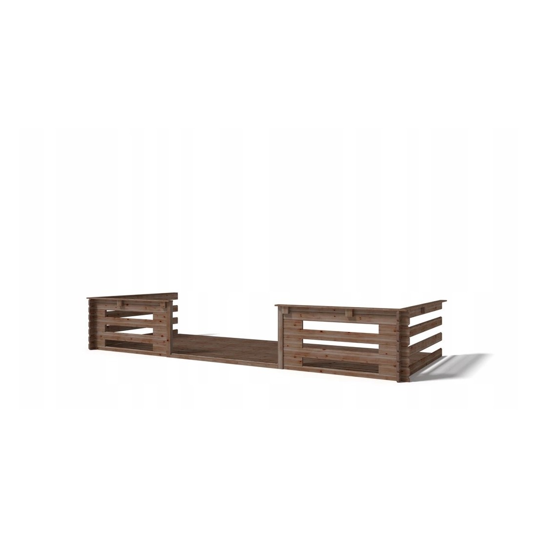 De veranda is voorzien van een balustrade en vervaardigd uit geïmpregneerd hout in de kleur bruin. Ze past perfect bij houten tuinhuizen met een voorzijde van 5 m breed en een wanddikte van 28 mm.