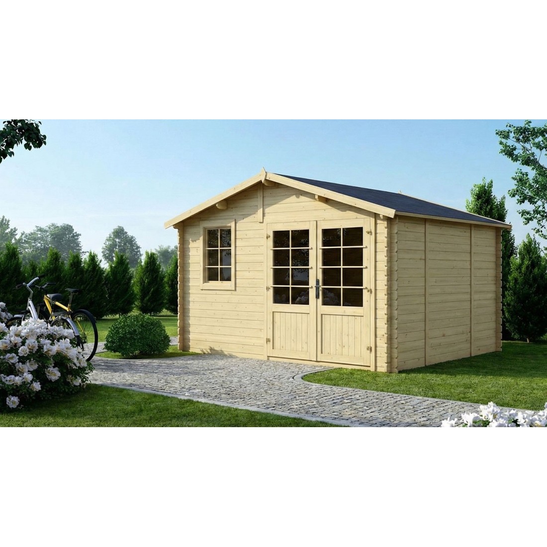 De natuurlijke uitstraling van het hout past harmonieus in elke tuin en creëert een warme, ordelijke sfeer.Een duurzaam en onderhoudsvriendelijk tuinhuis – gemaakt om jarenlang van te genieten.