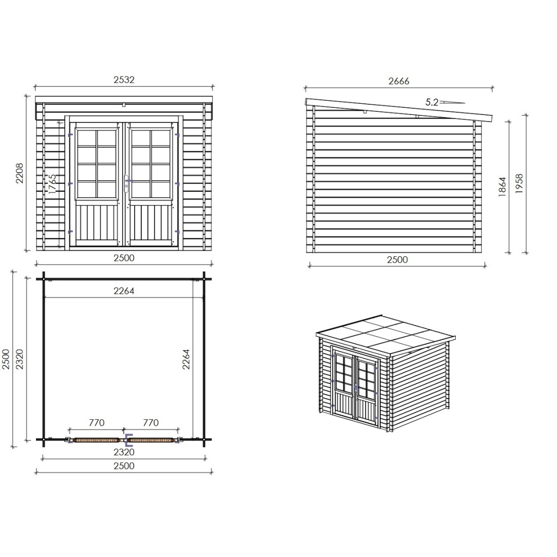 Tijdloos, praktisch en duurzaam – een stijlvolle opbergruimte voor elke tuin. Het houten gereedschapshuis DOM724 heeft een oppervlakte van 6.25 m², een breedte van 2.5 m, een diepte van 2.5 m en een wanddikte van 28 mm. De montage verloopt eenvoudig dankzij de duidelijke handleiding en zorgvuldig voorbereide onderdelen.