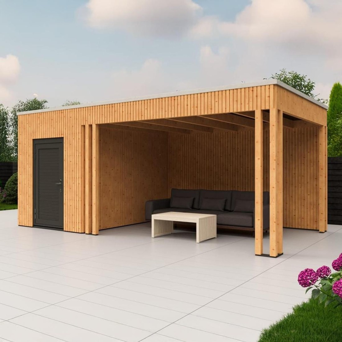 Stel u een plek voor waar praktisch gemak en ontspannen buitenleven samenkomen. Het Rhombus tuinhuis met overkapping combineert een ruime berging met een stijlvolle overdekte buitenruimte waar u het hele jaar door kunt genieten van uw tuin.