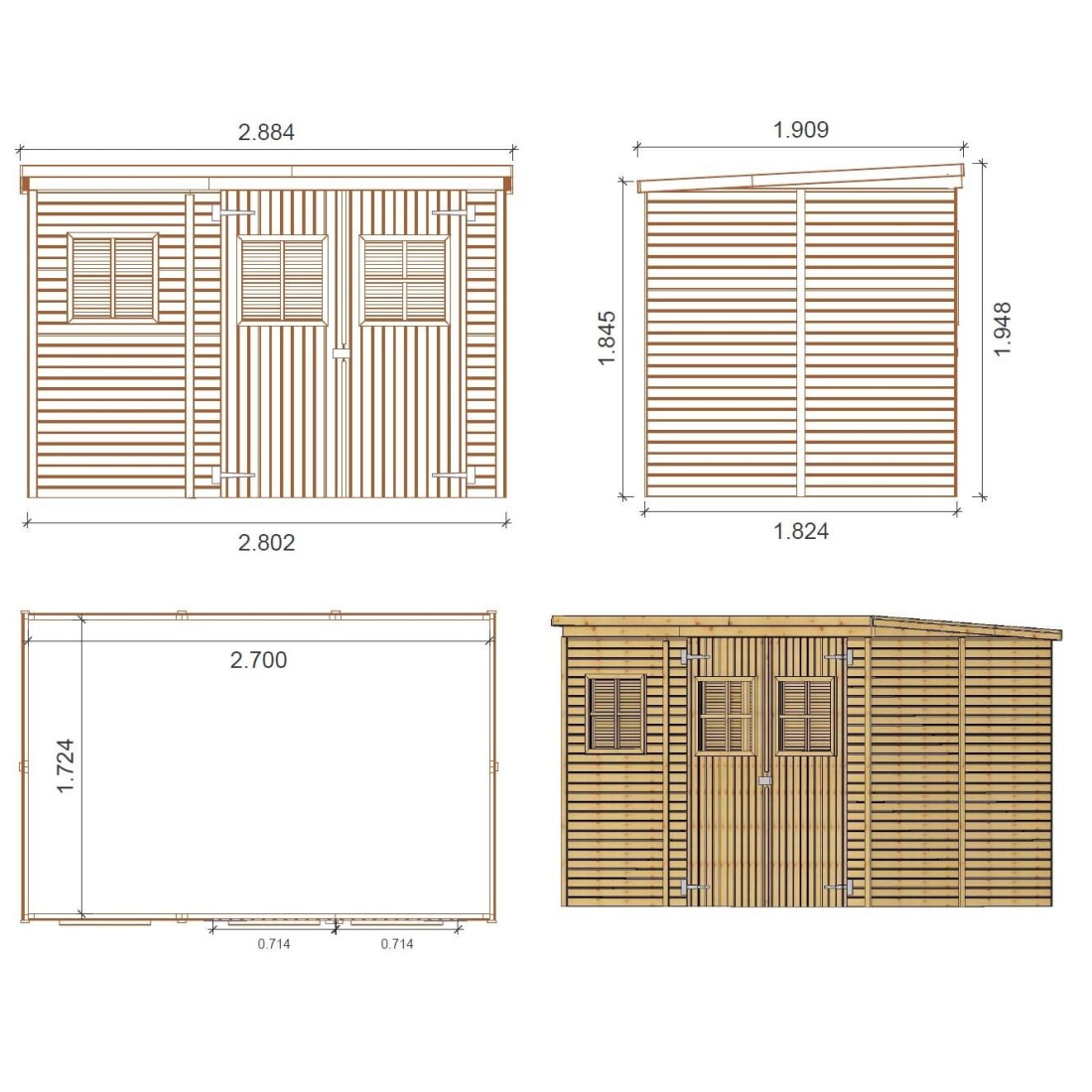 Met een oppervlakte van 4.86 m², een breedte van 2.7 m en een diepte van 1.8 m biedt dit tuinhuis volop ruimte voor het opbergen van tuinmeubels, gereedschap en accessoires.