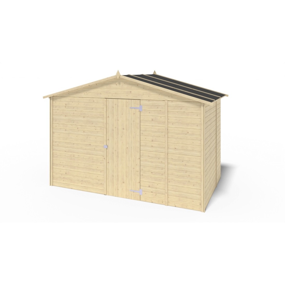 De houten kiosk DOM606 heeft een oppervlakte van 5.72 m², met een breedte van 3.11 m, een diepte van 1.84 m en een wanddikte van 19 mm.