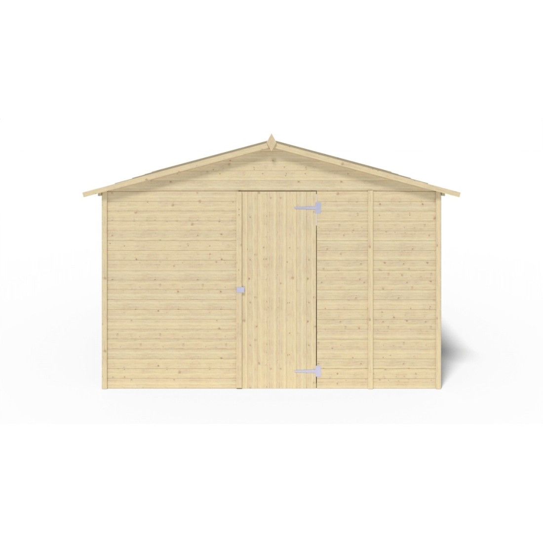 De houten kiosk DOM607 heeft een oppervlakte van 9.42 m², met een breedte van 3.11 m, een diepte van 3.03 m en een wanddikte van 19 mm.