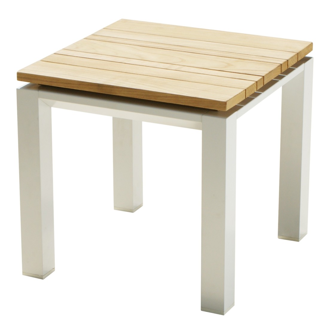 Tafelblad gemaakt van teakhout met een dikte van 18 mm.Licht aluminium frame, gepoedercoat in wit (RAL9010).