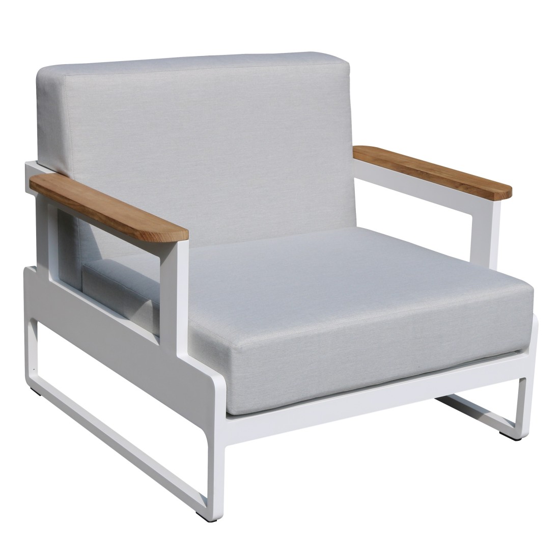 Zittinghoogte: 36 cm.Licht aluminium frame, gepoedercoat in wit RAL9010.Polyester bekleding in grijs, met ritssluiting, afneembaar. Kussens gevuld met schuim.Product wordt als geheel verkocht.Garantieduur op textiele onderdelen: 1 jaar.Garantieduur op aluminium en houten onderdelen: 2 jaar.