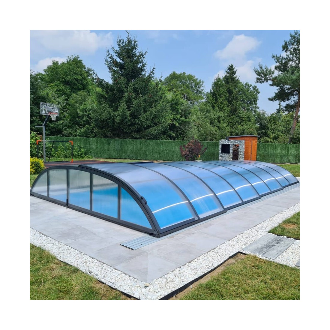 De overkapping is gemaakt van poliwęglan komorowy 8 mm, een materiaal dat zorgt voor uitstekende isolatie en bescherming tegen kou, sneeuw en ijs. Dit voorkomt warmteverlies, verlaagt het energieverbruik en houdt het zwembadwater aangenaam schoon.