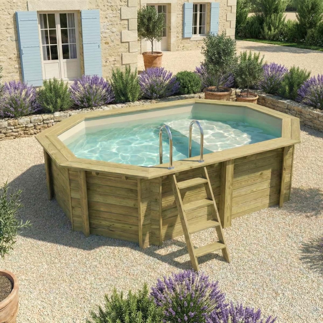 Hout geeft de omgeving een elegante en gezellige uitstraling, en dankzij het klassieke uiterlijk past het zwembad in elke tuin. U kunt houten terrassen, planten of decoratieve verlichting toevoegen om een sfeervolle ruimte te creëren.