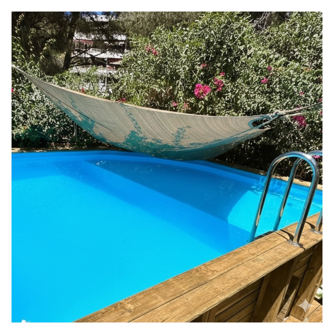 Het zwembad is gemaakt van geïmpregneerd grenenhout dat, dankzij het impregneerproces: