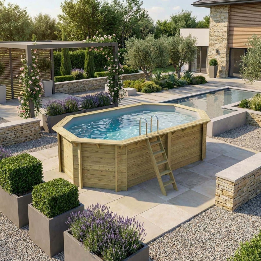 Hout geeft de omgeving een elegante en gezellige uitstraling, en dankzij het klassieke uiterlijk past het zwembad in elke tuin. U kunt houten terrassen, planten of decoratieve verlichting toevoegen om een sfeervolle ruimte te creëren.