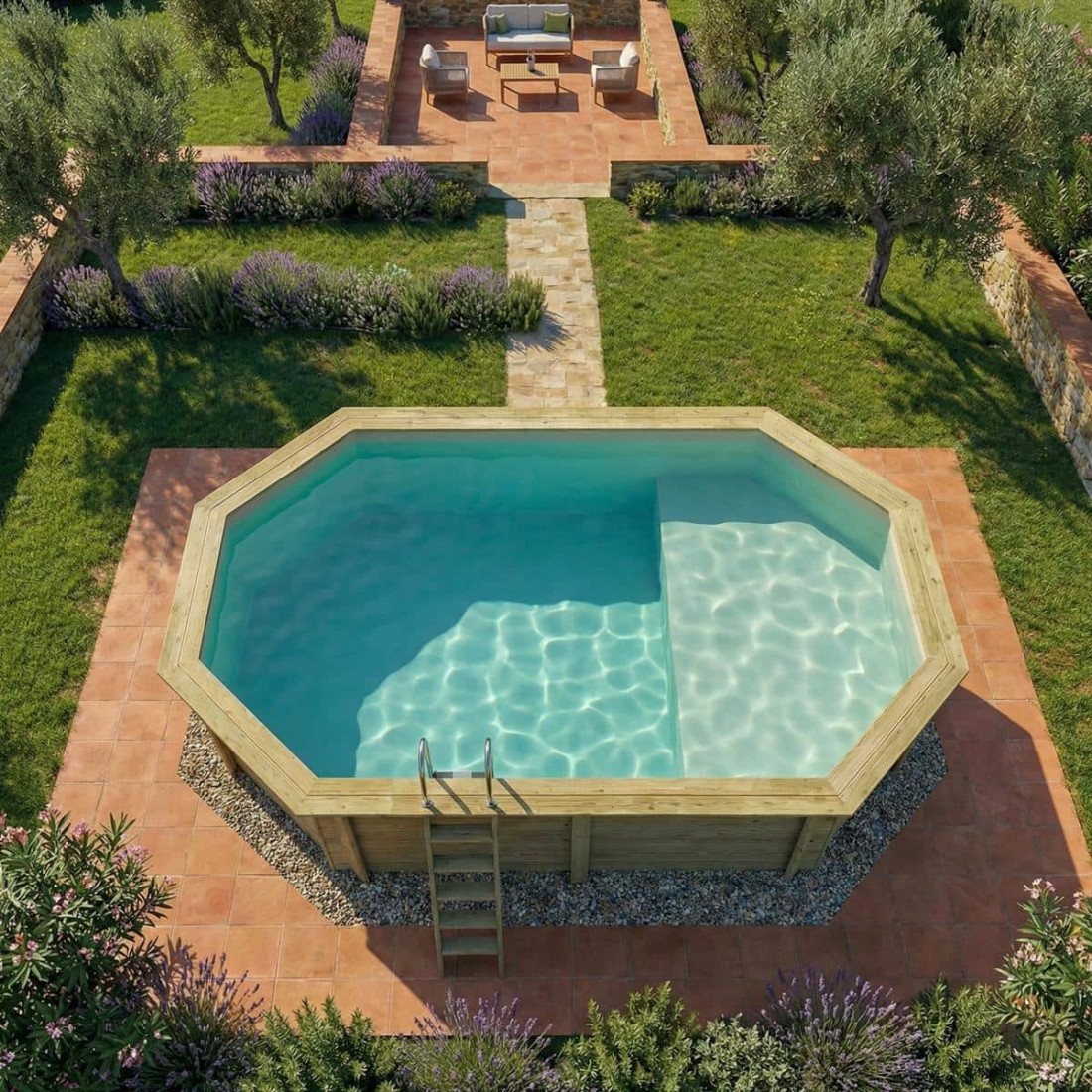 Het zwembadmodel met afmetingen 5.79 × 3.49 m en een hoogte van 1.45 m biedt twee diepteniveaus – ontworpen voor wie meer wil dan een standaard tuinzwembad.