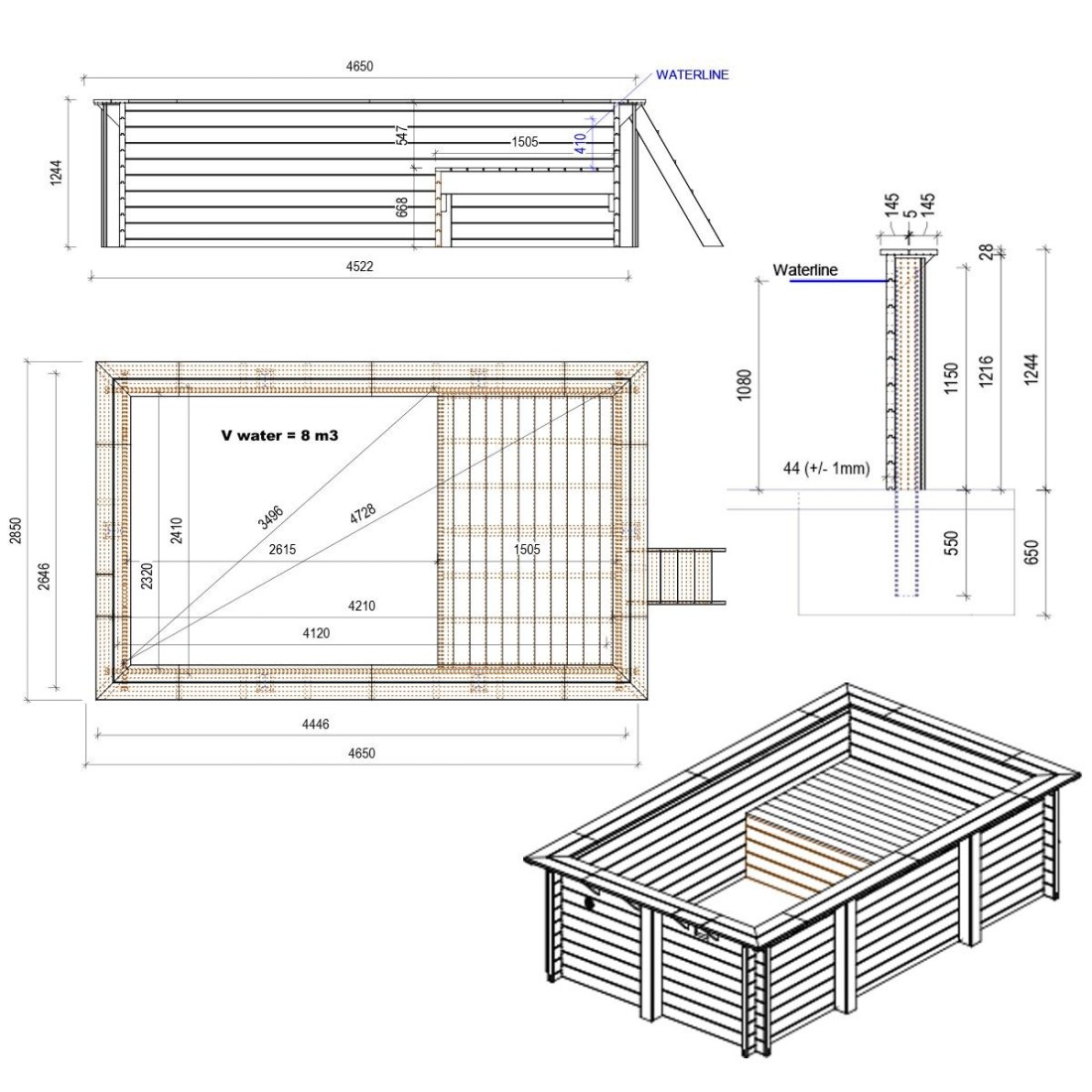 Het zwembadmodel met afmetingen 4.65 × 2.85 m en een hoogte van 1.24 m biedt twee diepteniveaus – ontworpen voor wie meer wil dan een standaard tuinzwembad.