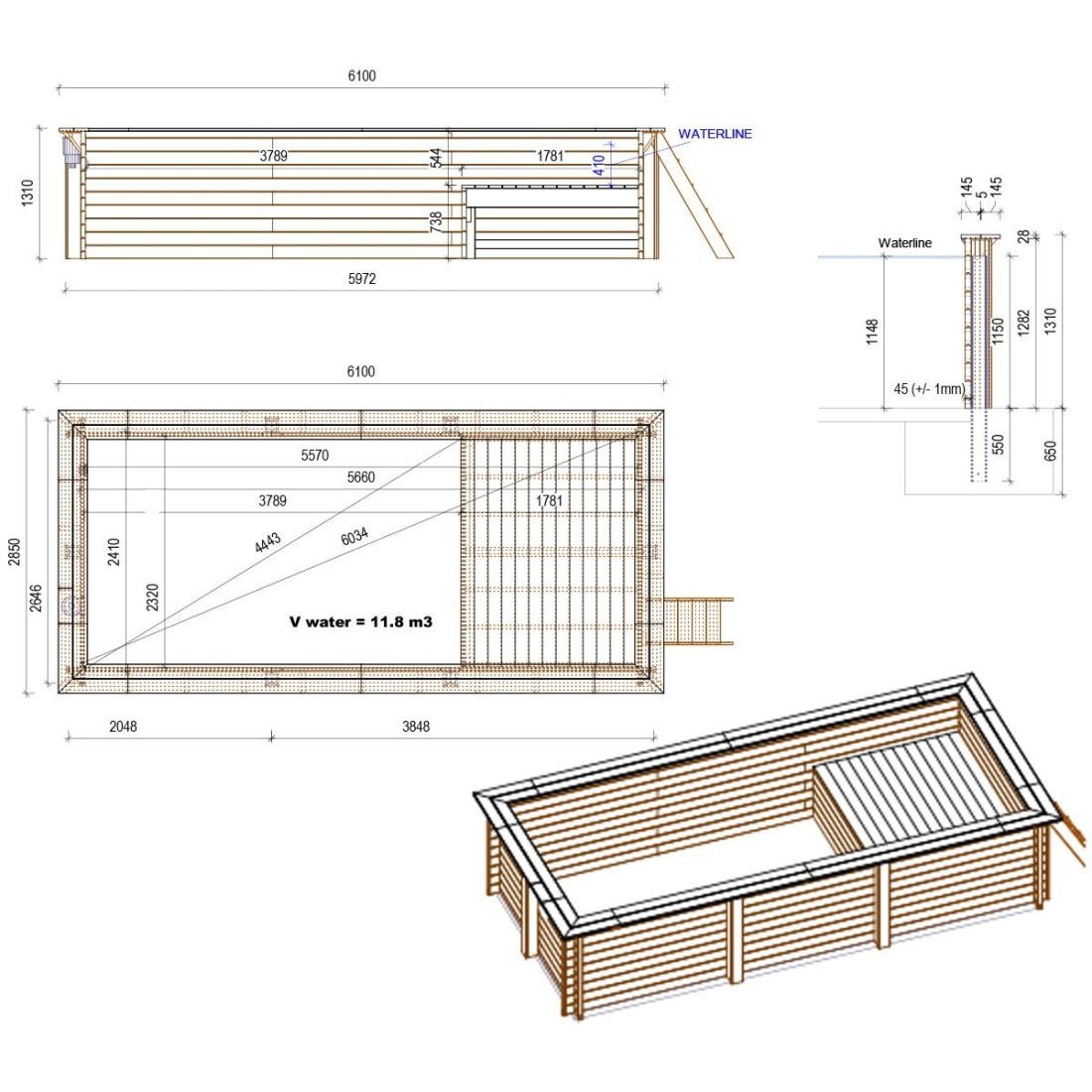 Het zwembadmodel met afmetingen 6.1 × 2.85 m en een hoogte van 1.31 m biedt twee diepteniveaus – ontworpen voor wie meer wil dan een standaard tuinzwembad.