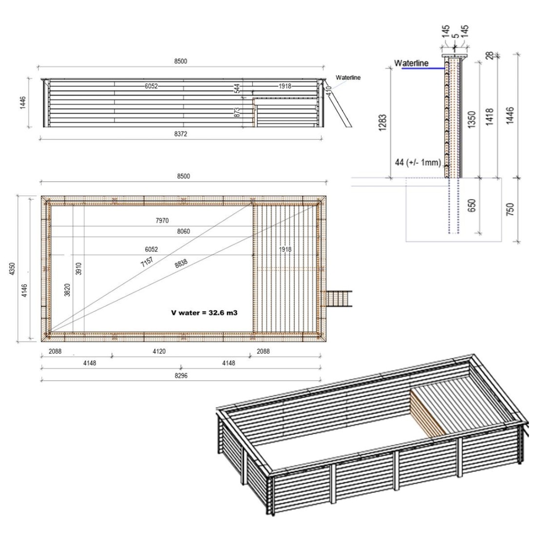 Het zwembadmodel met afmetingen 8.5 × 4.35 m en een hoogte van 1.45 m biedt twee diepteniveaus – ontworpen voor wie meer wil dan een standaard tuinzwembad.